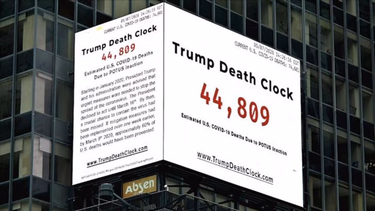 New York: A newly erected billboard at New York's Times Square shows the number of US coronavirus deaths that its creator says could have been avoided if President Donald Trump had acted sooner and it's called the "Trump Death Clock”.