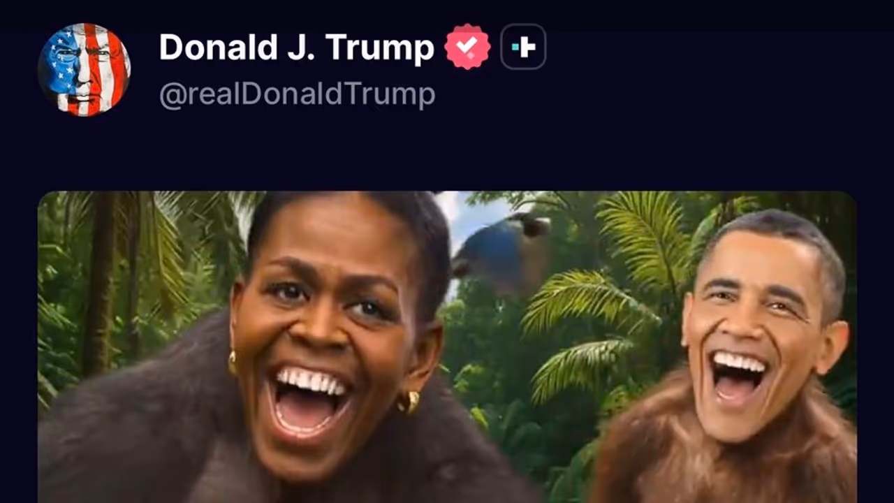 Near the end of a one-minute-long video posted on Trump's Truth Social platform, the Obamas are shown with their faces on the bodies of monkeys for about one second.