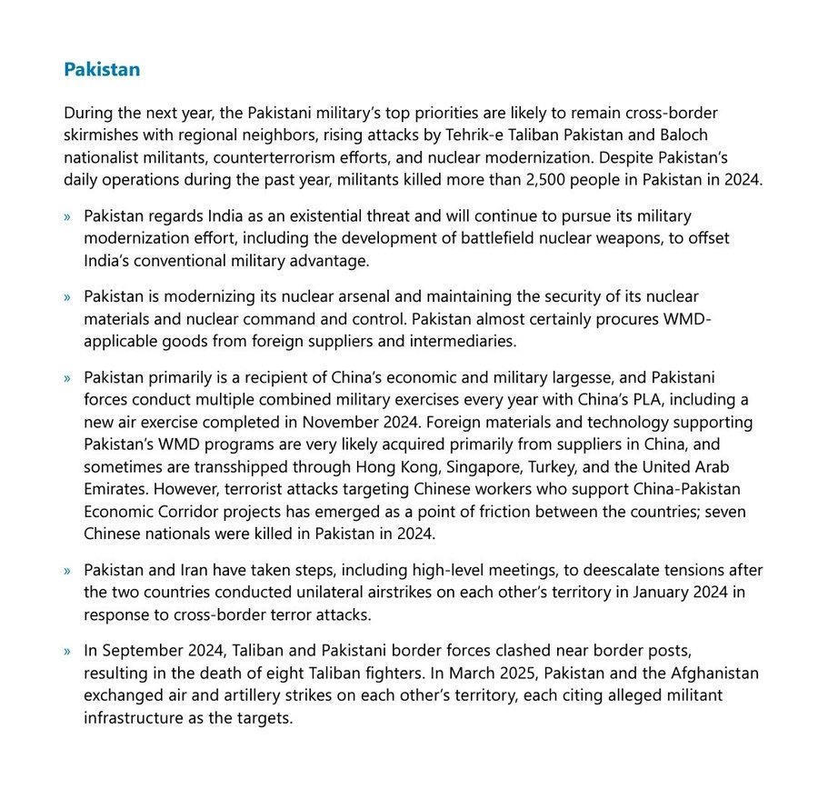 As global adversaries exploit emerging technologies and geopolitical openings, the report stresses that countries like Pakistan, already armed with nuclear capabilities and tied closely to powers like China, must be closely monitored. The US warns that the accelerating pace of innovation will only multiply such threats in the coming years.