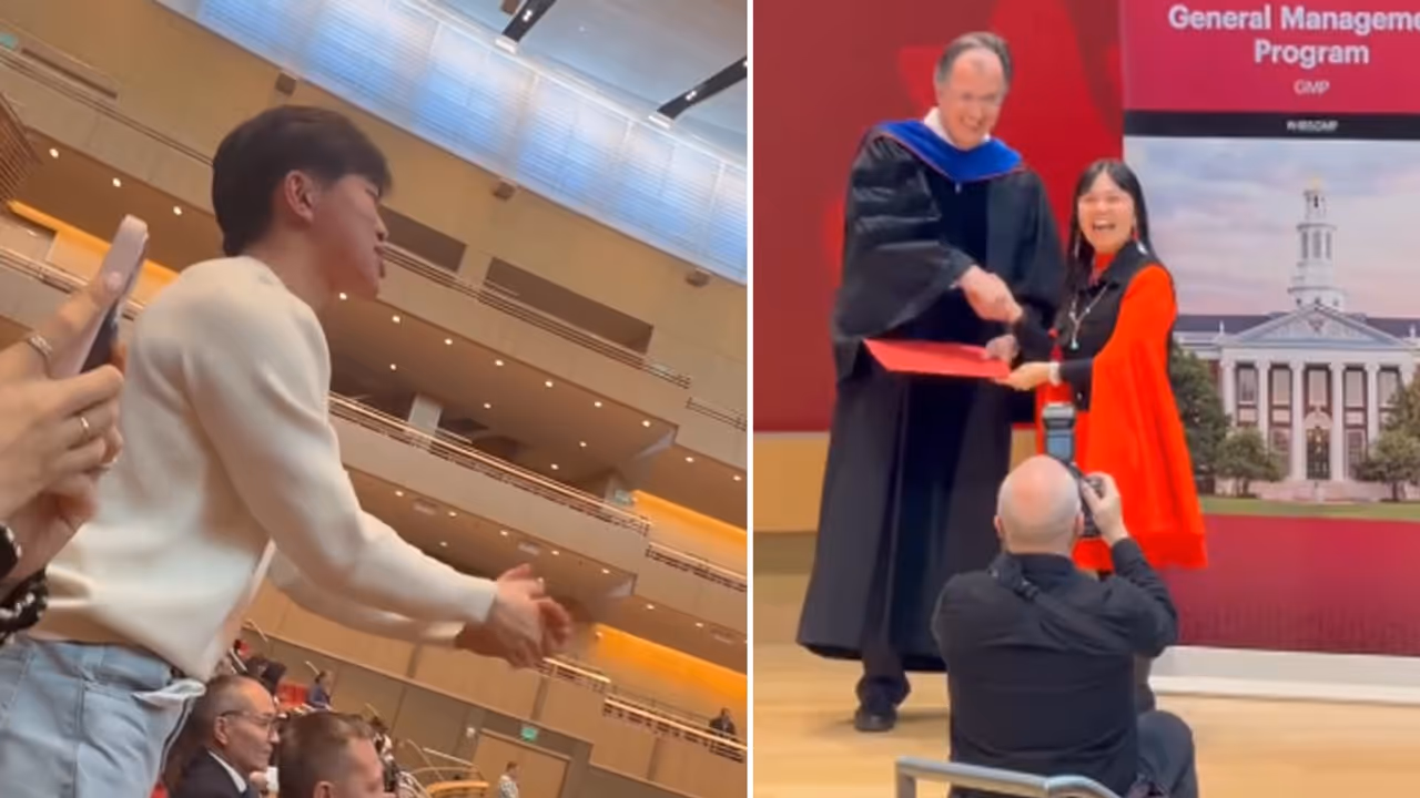 Social media users have been moved by a touching video of a youngster enthusiastically supporting his mother at her Harvard University graduation ceremony. Eddie Lou posted the video on Instagram, where he can be seen sitting in the crowd when his mother crosses the stage to get her degree. Lou gets up from his chair and lets out loud applause as soon as his mother gets her degree, clearly excited and proud of the occasion. His emotional response soon emerged as the video's high point. The clip was shared with a simple caption that read, “My throat hurts.”