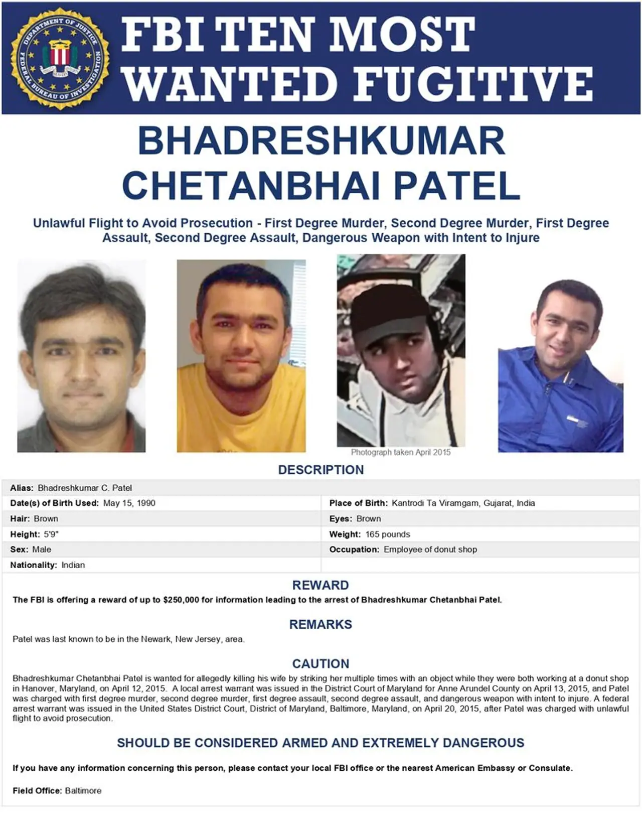 Bhadresh Patel, a 33-year-old Gujarati, disappeared in 2015 after fatally murdering his wife Palak Patel at a Dunkin Donuts store in Hanover, Maryland. Since then the FBI has been following him nonstop and added Patel's name as one of the agency's ten most wanted fugitives in the US on April 18, 2017. Patel was included as the FBI's Ten Most Wanted as the 514th fugitive.