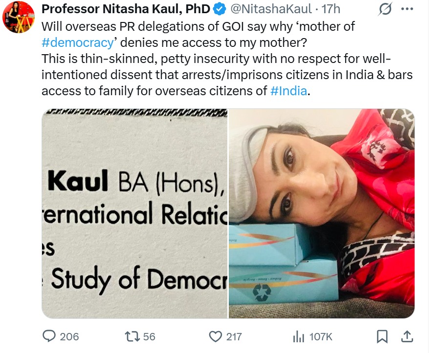 In her X post, Kaul questioned, “Will overseas PR delegations of GOI say why ‘mother of #democracy’ denies me access to my mother?” She further criticized the BJP government, saying, “This is thin-skinned, petty insecurity with no respect for well-intentioned dissent that arrests/imprisons citizens in India & bars access to family for overseas citizens of #India.”